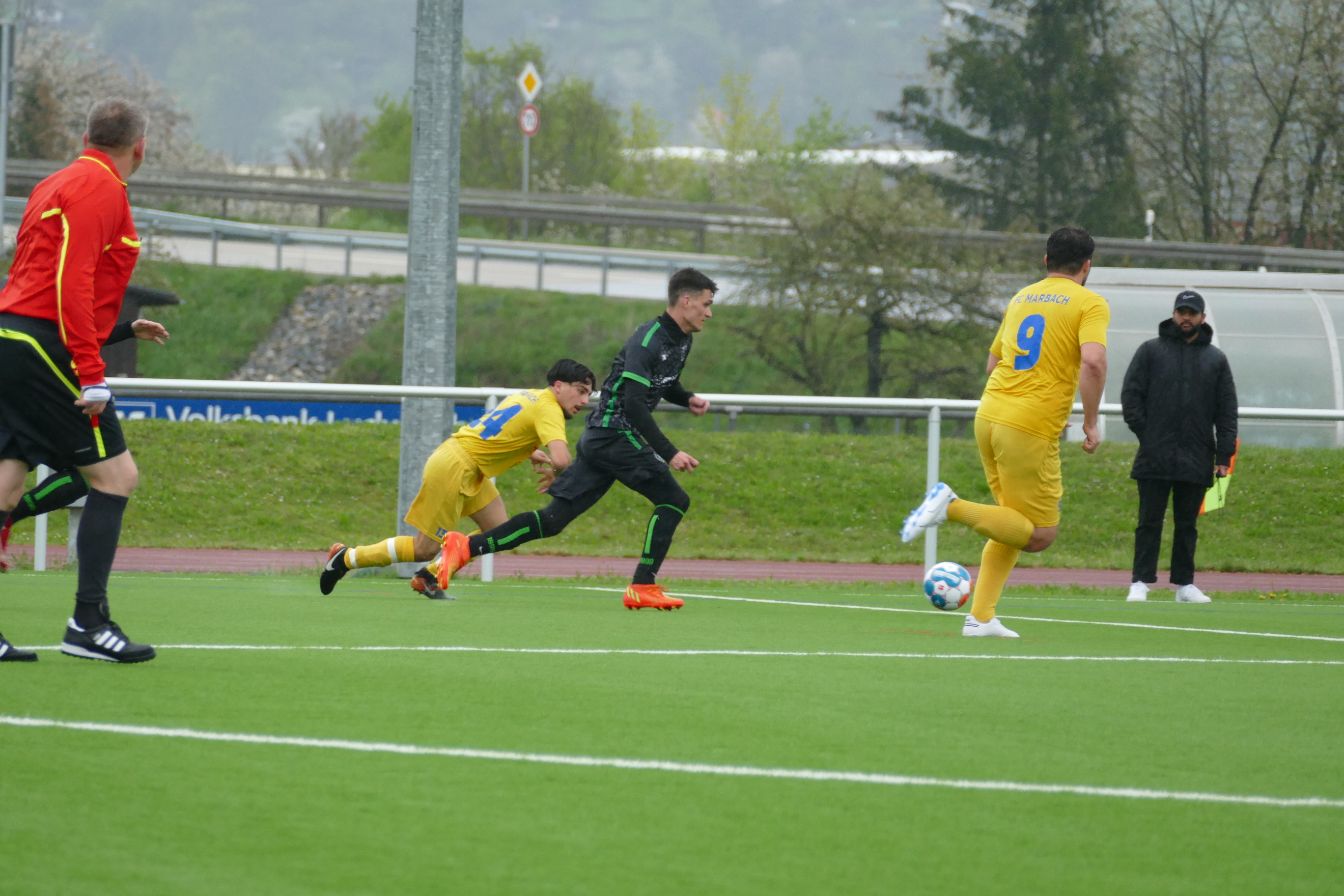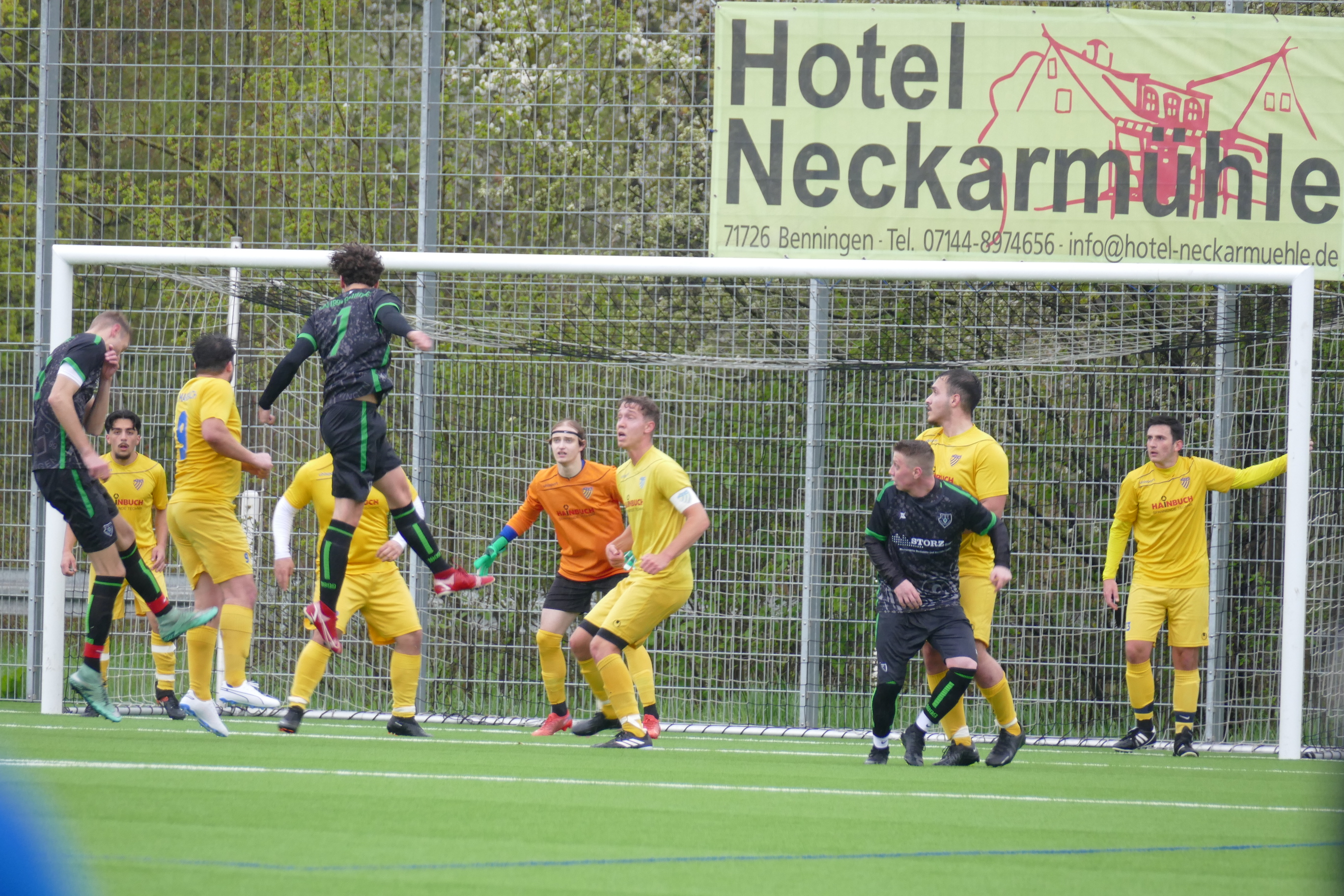 Bei windigem und regnerischem Wetter begann das Spiel in Benningen relativ schleppend. Beide Mannschaften hatten sichtlich Problem auf dem nassen Kunstrasen den Ball zu kontrollieren, was sich in den Anfangsminuten deutlich zeigte. Oft wurde versucht den Ball lang zu spielen umso die Stürmer in aussichtsreiche Positionen zu bringen. Nach den ersten 15 Minuten hatten die Jungs aus Benningen sich an die Platzverhältnisse gewöhnt und versuchten fortan den Ball über schnelle Ballstafetten nach vorne zu treiben. Michael Brendel hatte somit die erste große Chance im Spiel nachdem er frei vor dem Tor zum Abschluss kam, der Ball aber nur knapp den Pfosten verfehlte. In der 30. Minute kam es zum verdienten Führungstreffer. Nach einem Eckball versuchte die Marbacher Hintermannschaft den Ball zweimal zu klären, wobei letzterer Versuch scheiterte und Robin Fleischmann aus knapp sieben Meter vor dem Tor zum Abschluss kam und den Ball im Netz unterbrachte. Keine fünf Minuten später zappelte der Ball zum 2:0 im Marbacher Tor. Wieder war es nach einem Eckball, welcher scharf auf den ersten Pfosten getreten wurde und Kevin Keil aus kürzester Distanz den Ball über die Linie drückte. Von den Gästen aus Marbach kamen bis dato kaum gefährliche Angriffe aufs Tor der Benninger, lediglich der ein oder andere Distanzschuss welcher keine Gefahr darstellte.